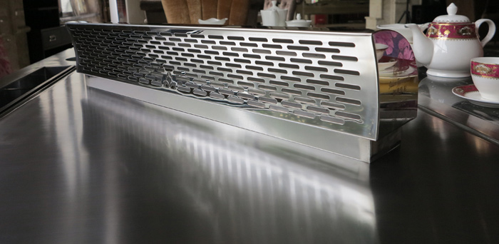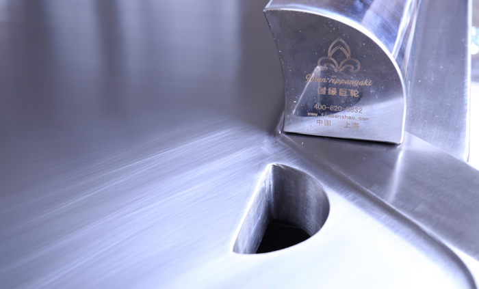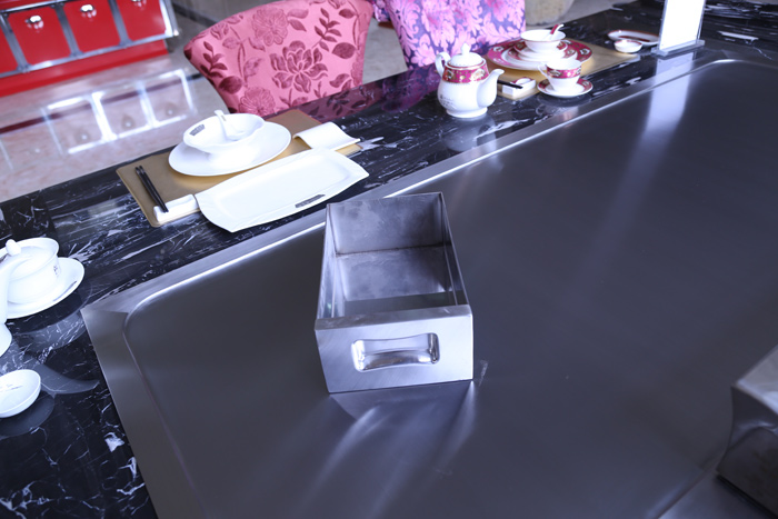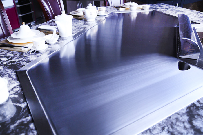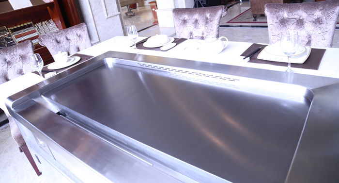 一体成型铁板烧台面:采用进口合金钢,一体成型,厚度为20mm,其材质不变形、不变色。